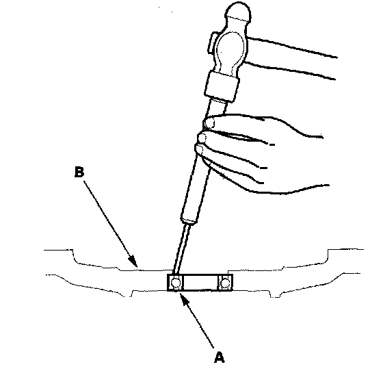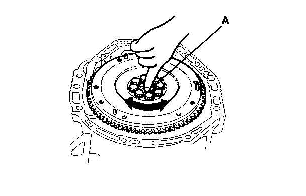 4. Turn the inner race of the ball bearing (A) with your finger. The ball bearing should turn smoothly and quietly. Check that the ball bearing outer race fits tightly in the flywheel. If the race does not turn smoothly, quietly, or fit tight in the flywheel, replace the ball bearing.