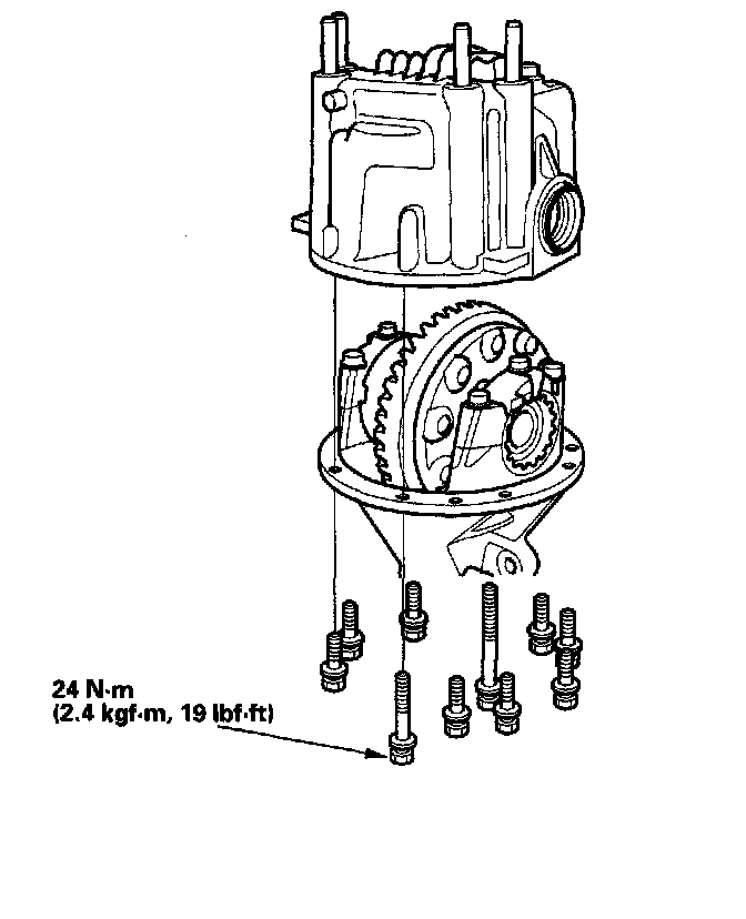 4. Install the differential case assembly, then torque the 10 mounting bolts in a crisscross pattern in several steps.