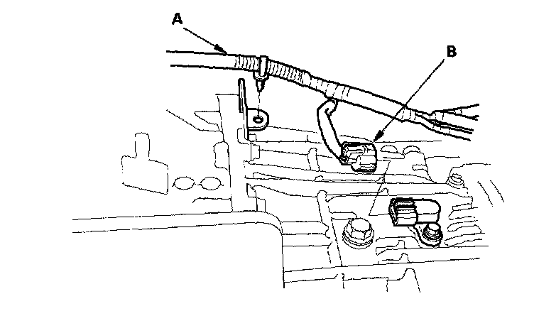 7. Install the wire harness (A) to the transmission, then connect the pickup sensor connector (B).
