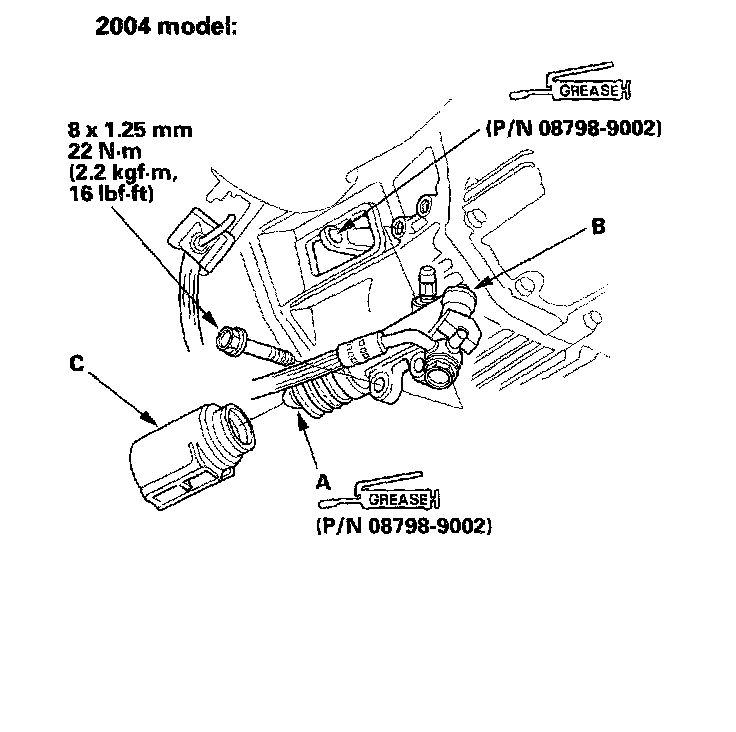 13. Apply super high urea grease (P/N 08798-9002) to the end of the slave cylinder push rod (A). Install the slave cylinder (B) and the release fork boot (C).