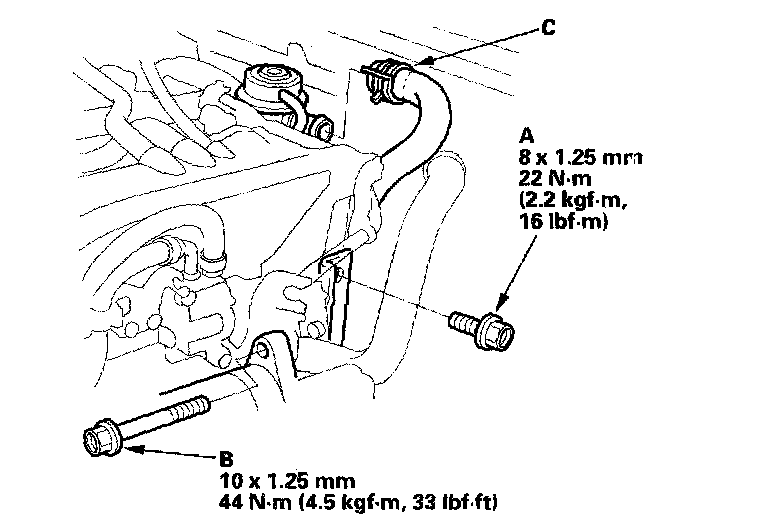 24. Install the upper intake manifold bracket mounting bolt (A) and upper starter motor mounting bolt (E). Connect the hose (C) to the suction valve.