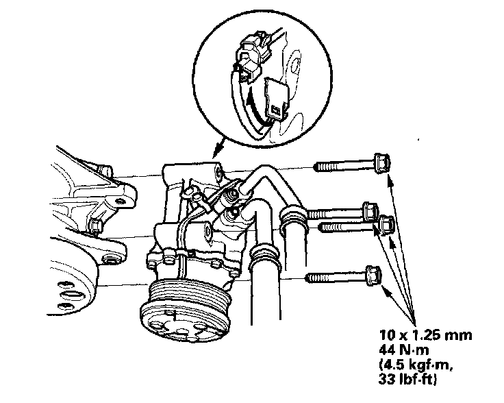 27. Install the A/C compressor, then connect the 1P connector.