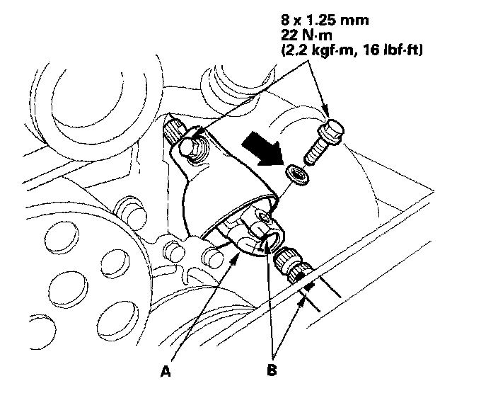 19. Install the intake manifold bracket (A) lower mounting bolt, then install the wire harness (B) on the intake manifold bracket.