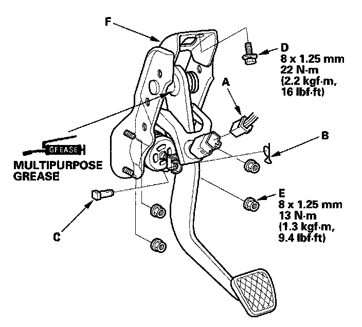 3. Remove the brake pedal bracket mounting bolt (D) and nuts (E).