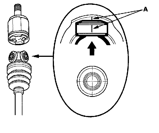 ^ Reinstall the inboard joint onto the driveshaft by aligning the marks (A) you made on the inboard joint and the rollers.