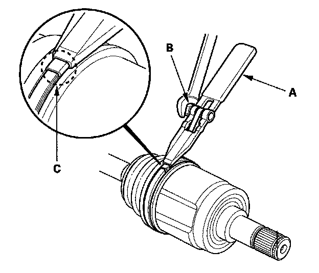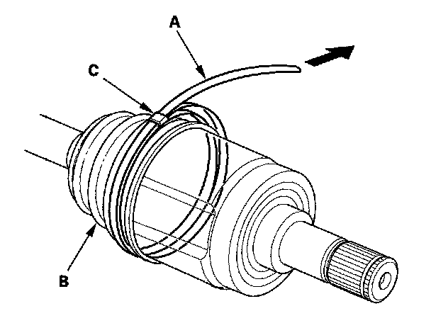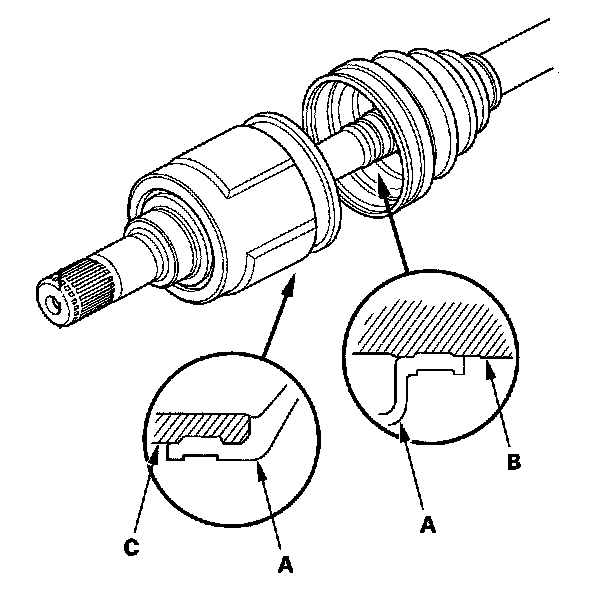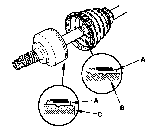 9. Fit the boot (A) ends onto the driveshaft (B) and outboard joint (C).