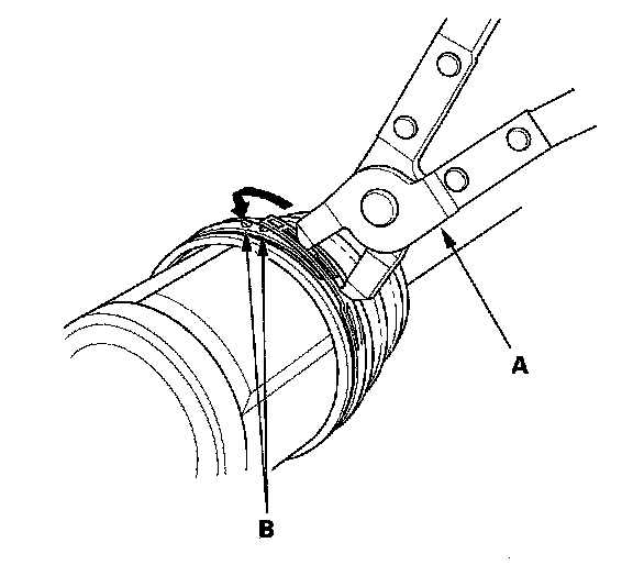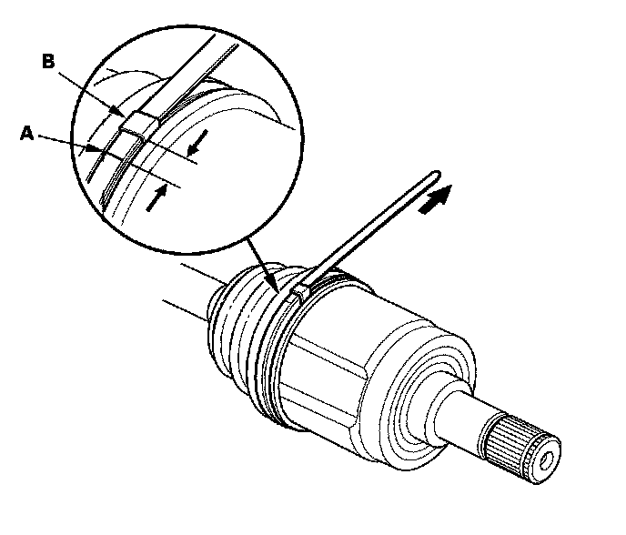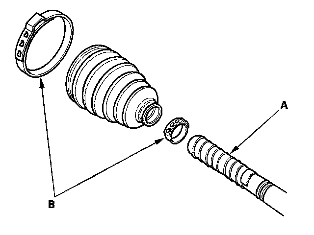 14. Fit the boot ends onto the driveshaft and the inboard joint, then install the new double loop band (A) on to the boot (B).