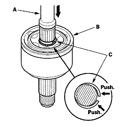 5. Insert the driveshaft (A) into the outboard joint (B) until the stop ring (C) is close to the joint.