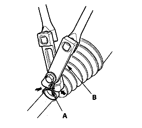 12. Close the hook portion of the band with commercially available boot band pliers (A), then hook the tabs (B) of the band.