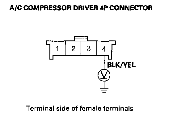 4. Measure the voltage between the A/C compressor driver 4P connector No. 4 terminal and body ground.