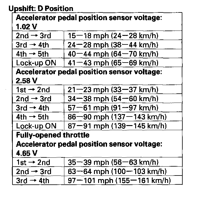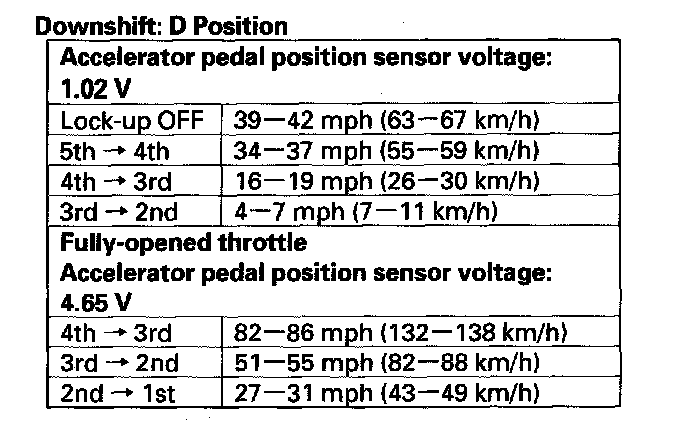 5. Test-drive the vehicle on a flat road in the D position. Check for abnormal noise and clutch slippage. While driving, check that the shift points occur at the proper speeds by monitoring the accelerator pedal position sensor voltage with the HDS and comparing your shift point speeds and voltage to those in the table. (The accelerator pedal position sensor voltage represents the throttle opening.)