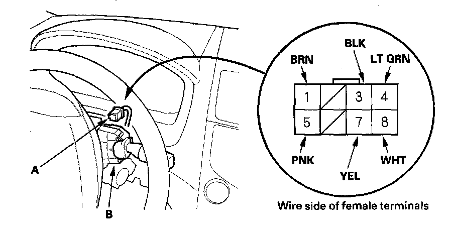 4. Disconnect the 8P connector (A) from the wiper/washer switch (B).