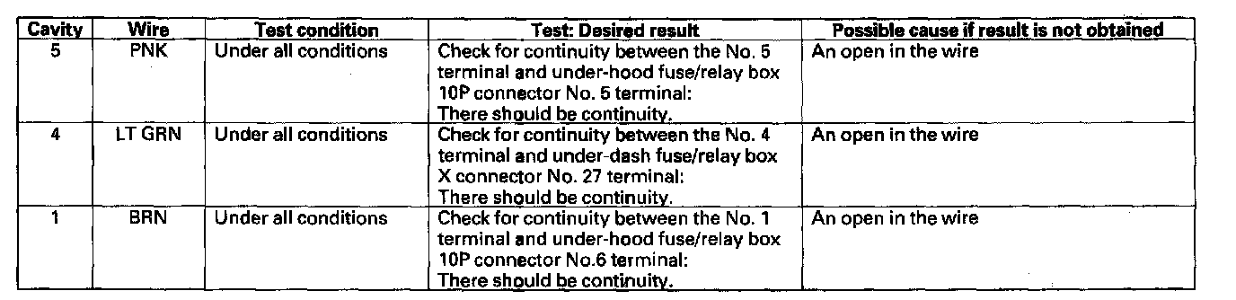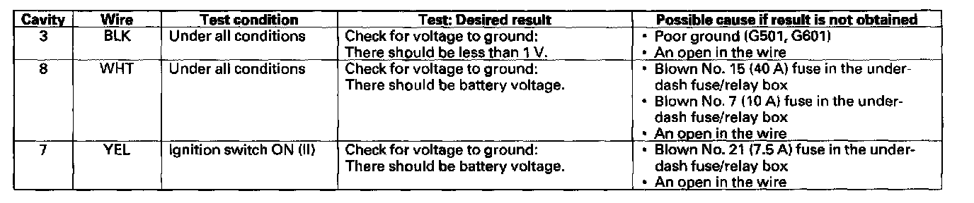 7. Reconnect the connector to the wiper/washer switch, and make these input tests at the connector.