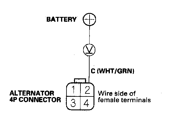 5. Measure the voltage between alternator 4P connector terminal No. 2 and the positive terminal of the battery.