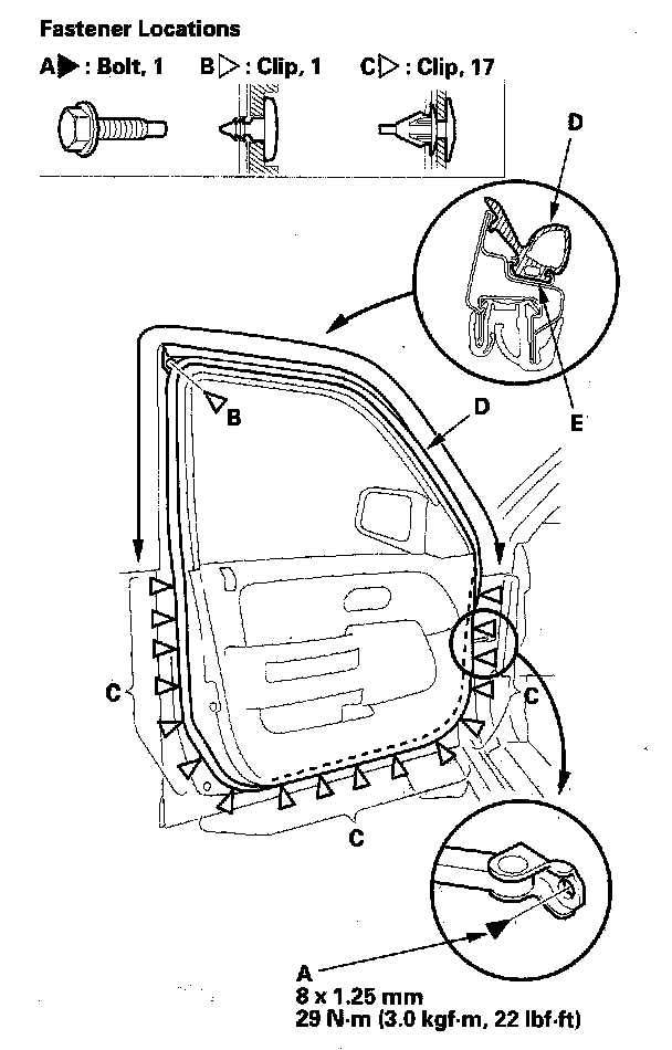 2. Detach the clips (B, C), then remove the door weatherstrip (D).