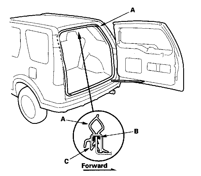 4. Locate the painted alignment mark (C) on the tailgate weatherstrip. Align the painted mark with the alignment tab in the center of the tailgate opening, and install the weatherstrip. Make sure it's seated completely and facing in the direction shown. Make sure there are no wrinkles in the weatherstrip.