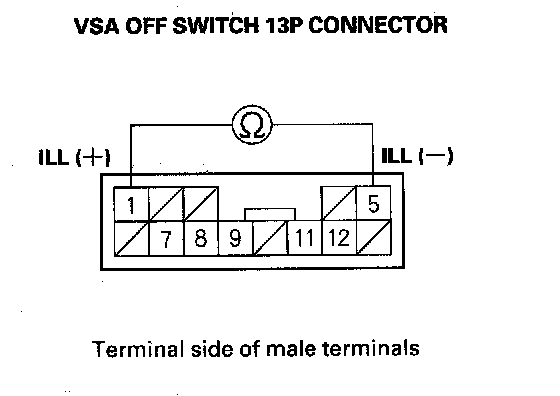 3. Check for continuity between the VSA OFF switch 13P connector terminal No. 11 and No. 12. There should be continuity when the switch is pressed, and no continuity when the switch is released.