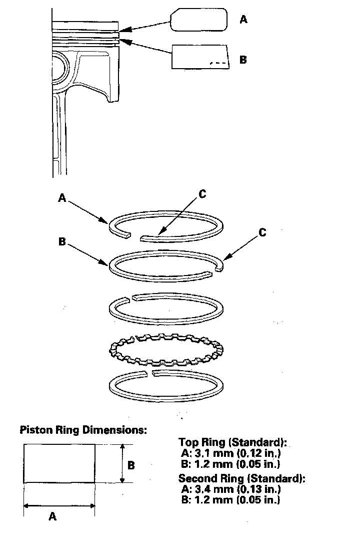 5. Measure the piston ring end-gap (B) with a feeler gauge: