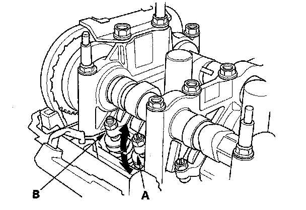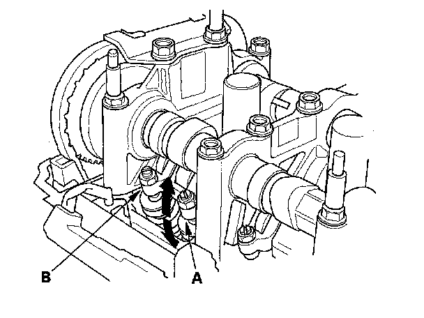 4. Verify that the intake primary rocker arm (A) moves independently of the intake secondary rocker arm (B).