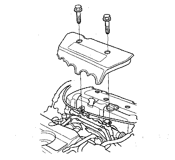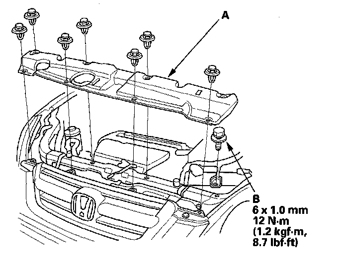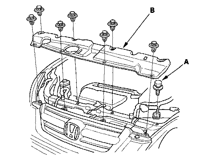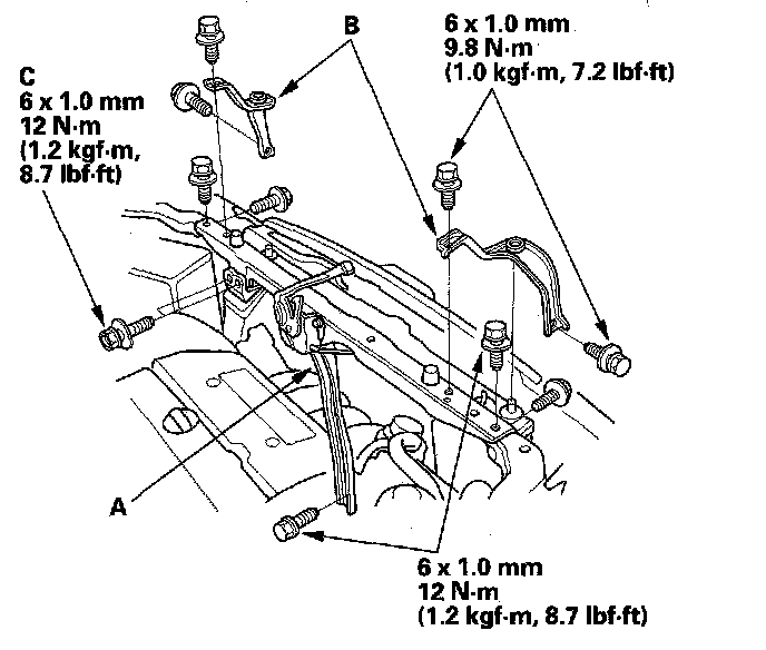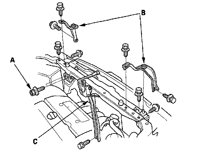 8. Remove the intake air duct mounting bolts (A) and upper bracket and cushions (B), then remove the bulkhead (C).