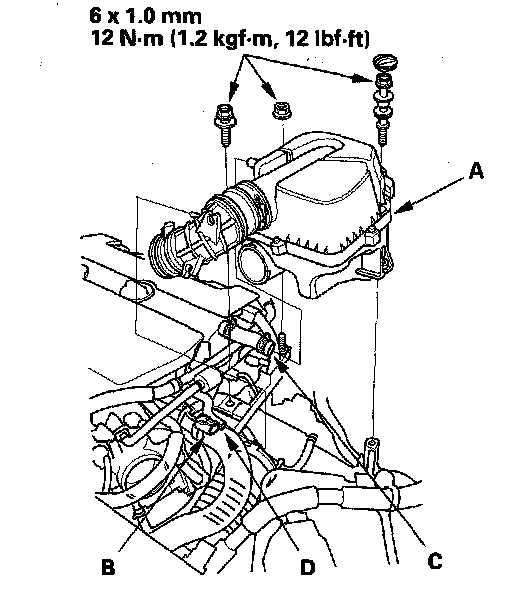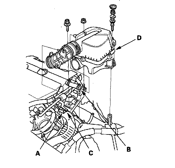 2. Disconnect the intake air temperature (IAT) sensor connector (A), remove the breather hose (B), and intake air bypass control thermal valve tube (C) then remove the air cleaner housing (D).