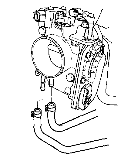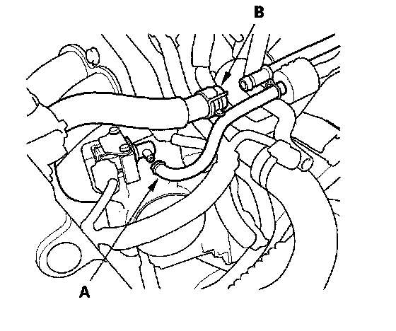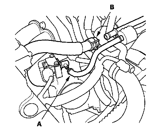 3. Remove the evaporative emission (EVAP) canister hose (A) and brake booster-vacuum hose (B).