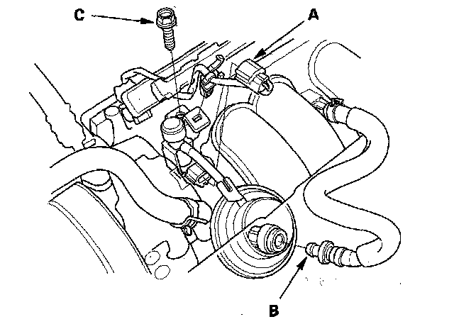 5. Disconnect the intake manifold tuning (IMT) (intake manifold runner control (IMRC) valve actuator control solenoid valve connector (A), then remove the positive crankcase ventilation (PCV) hose (B) and IMT (IMRC) valve control solenoid valve mounting bolt (C).
