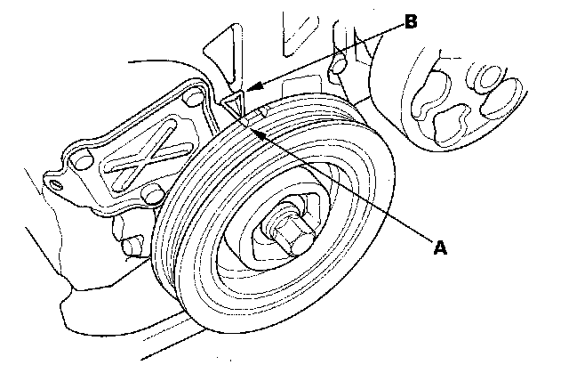 1. Turn the crankshaft pulley so its top dead Center (TDC) mark (A) lines up with the pointer (B).