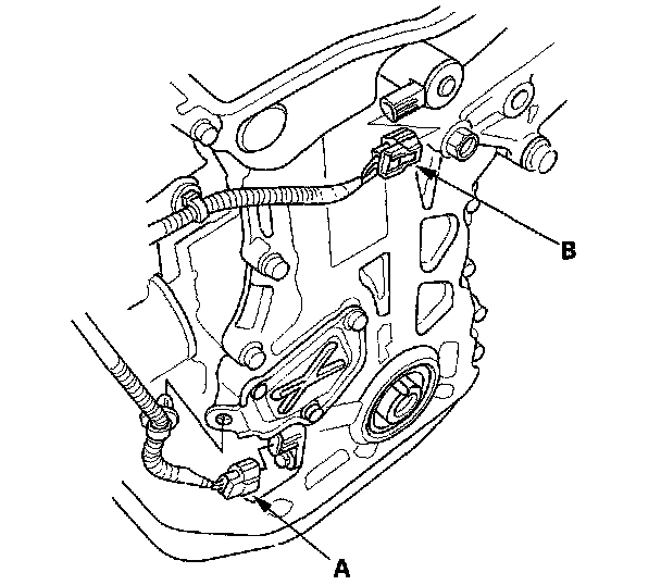 7. Disconnect the crankshaft position (CKP) sensor connector (A) and variable valve timing control (VTC) oil control solenoid valve connector (B).