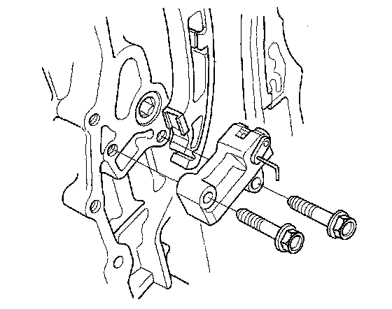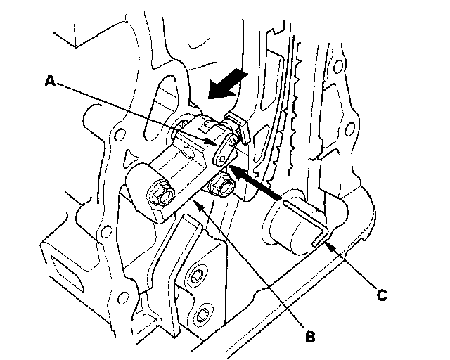15. Align the holes on the lock (A) and the auto-tensioner (B), then insert a 1.5 mm (0.06 inch) diameter pin (C) into the holes. Turn the crankshaft clockwise to secure the pin.