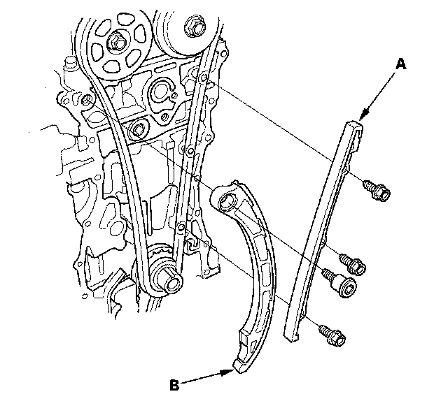 18. Remove the cam chain guide A (A) and tensioner arm (B).