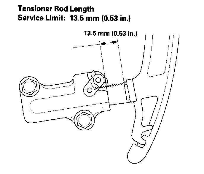 12. Measure the tensioner rod length between the tensioner body and bottom of the flat surface section on the tensioner rod. If the length is over the tolerance, replace the cam chain and oil pump chain.