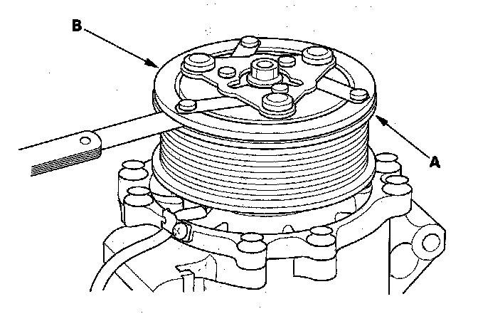 3. Measure the clearance between the rotor pulley (A) and the armature plate (B) all the way around. If the clearance is not within specified limits, remove the armature plate and add or remove shims as needed to increase or decrease clearance.