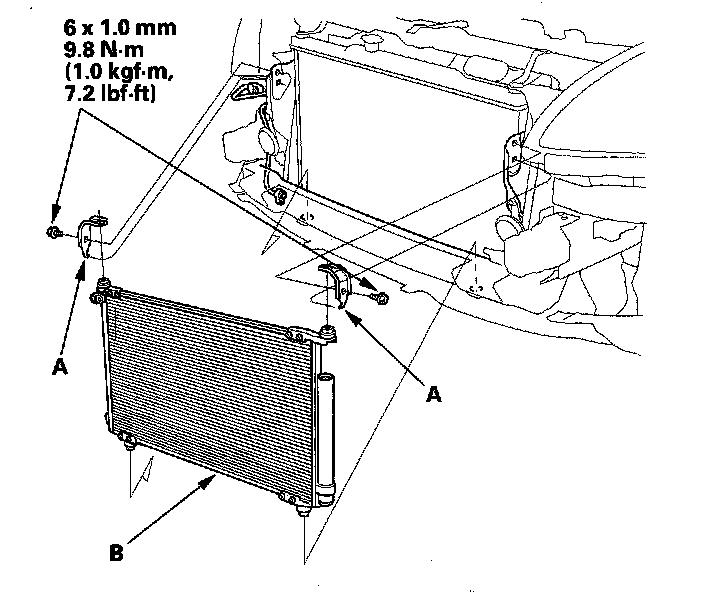 4. Remove the bolts and mounting brackets (A), then remove the A/C condenser (B) by lifting it up. Be careful not to damage the radiator or the A/C condenser fins when removing the A/C condenser.