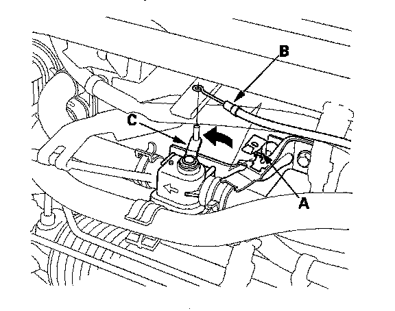 4. From under the hood, open the cable clamp (A), then disconnect the heater valve cable (B) from the heater valve arm (C). Turn the heater valve arm to the fully opened position as shown.