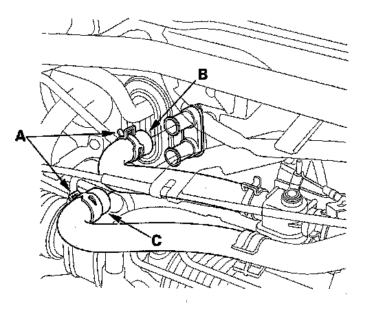 6. Slide the hose clamps (A) back, then disconnect the inlet heater hose (B) and the outlet heater hose (C) from the heater core. Engine coolant will run out when the hoses are disconnected; drain it into a clean drip pan. Be sure not to let coolant spill on the electrical parts or the painted surfaces. If any coolant spills, rinse it off immediately.