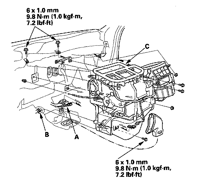 11. Disconnect the connector (A) from the heater unit, then disconnect the drain hose (B). Remove the mounting bolts and nuts, then remove the blower-heater unit (C).