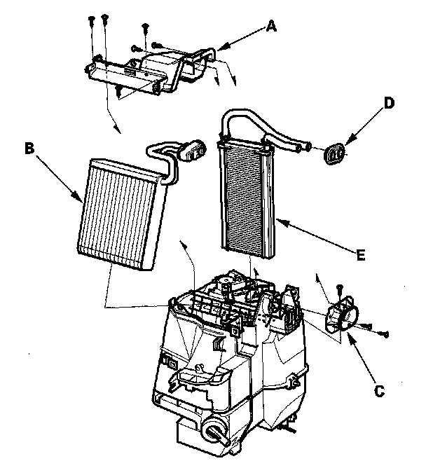 12. Remove the self-tapping screws and the expansion valve cover (A). Carefully pull out the evaporator core (B) so you don't bend the inlet and outlet pipes. Remove the self-tapping screws and the flange cover (C), then remove the grommet (D), and carefully pull out the heater core (E) so you don't bend the inlet and outlet pipes.
