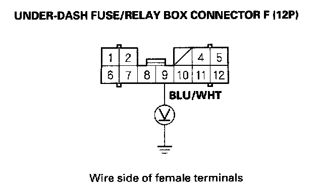 16. Using a backprobe set, measure the voltage between the No. 9 terminal of under-dash fuse/relay box connector F (12P) and body ground with the under-dash fuse/relay box connectors connected.