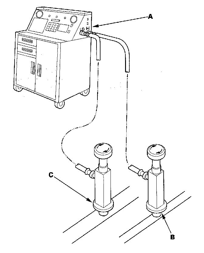 1. Connect an R-134a refrigerant recovery/recycling/charging station (A) to the high-pressure service port (B) and the low-pressure service port (C), as shown, following the equipment manufacturer's instructions.