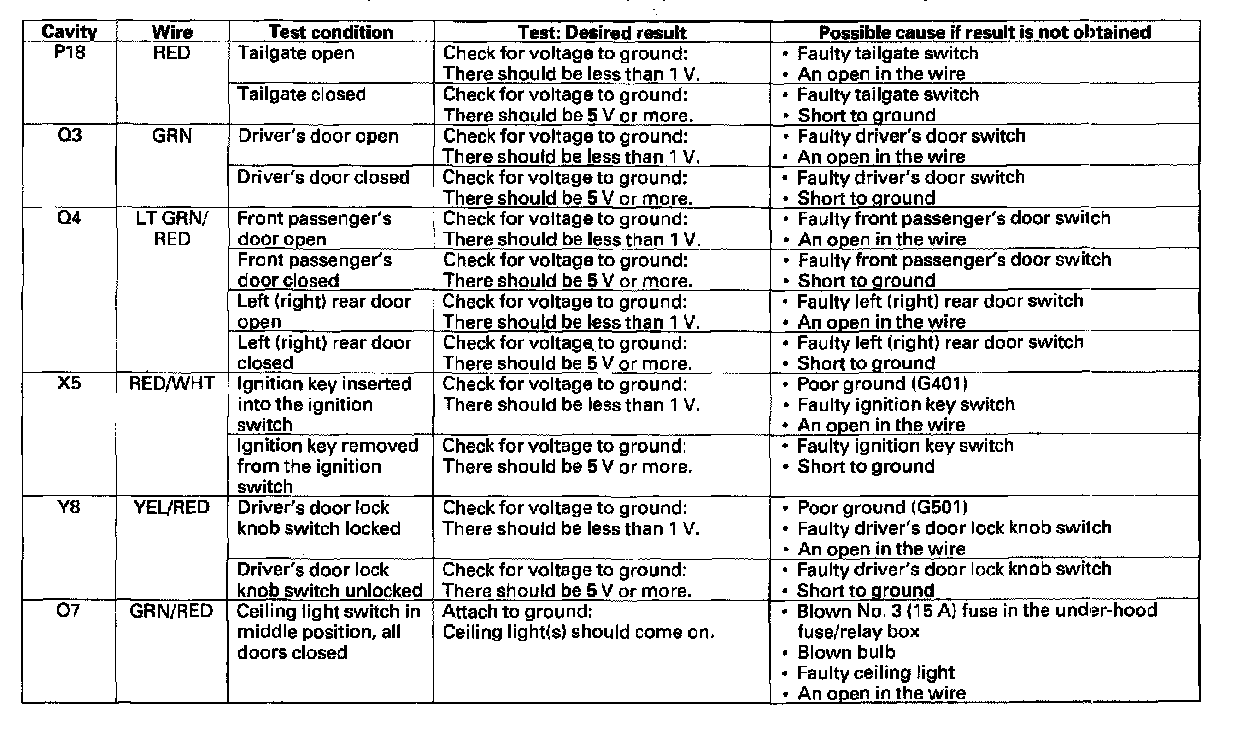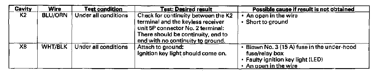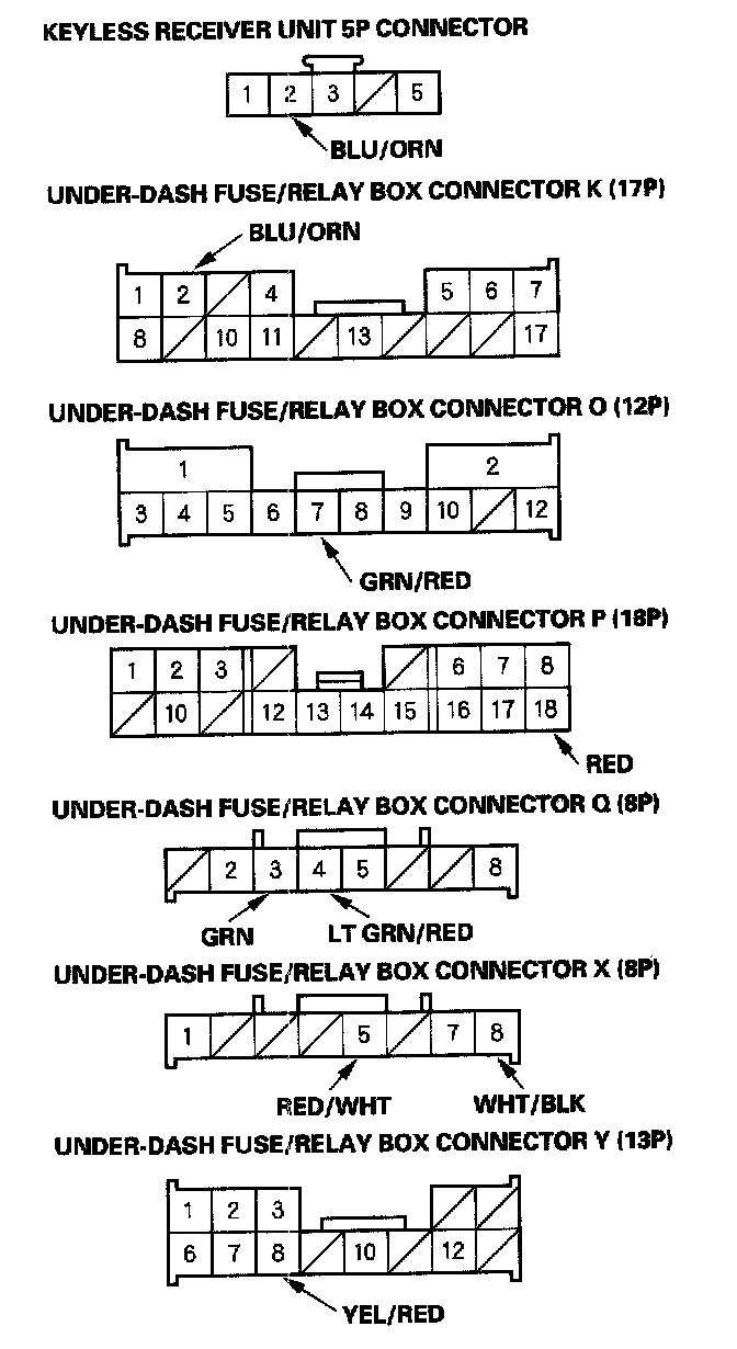 6. Reconnect the connectors to the under-dash fuse/relay box and turn the ignition switch ON (II) to keep the system awake, then make these input tests at the appropriate connectors on the under-dash fuse/relay box.