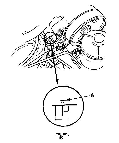 Check that the auto-tensioner indicator (A) is within the standard range (B) as shown. If it is out of the standard range, replace the