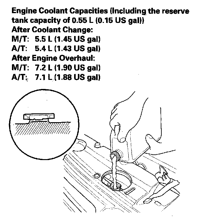 12. Pour Honda Long Life Antifreeze/Coolant Type 2 into the radiator up to the base of the filler neck.