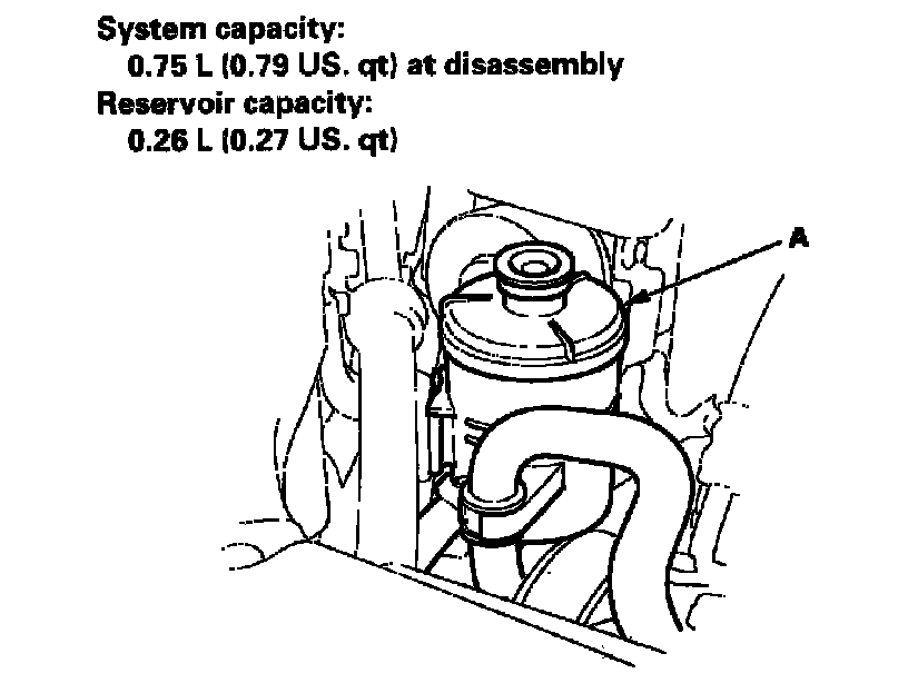 Fluid ReplacementCheck the reservoir (A) at regular intervals, and add the recommended fluid as necessary. Always use Honda Power Steering Fluid. Using any other type of power steering fluid or automatic transmission fluid can cause increased wear and poor steering in cold weather.