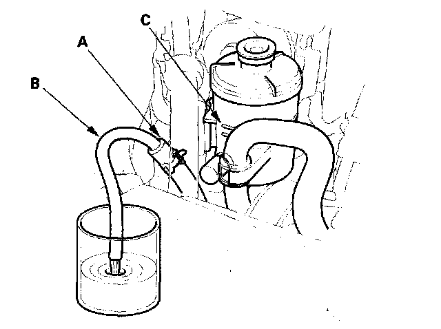 3. Start the engine, let it run at idle, and turn the steering wheel from lock-to-lock several times. When fluid stops running out of the hose, shut off the engine. Discard the fluid.