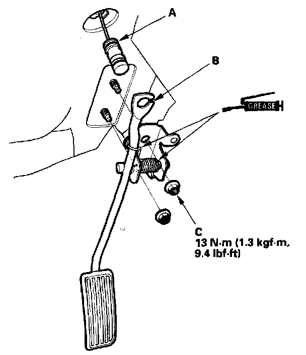 Remove the nuts (C) and the accelerator pedal.