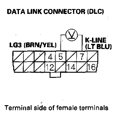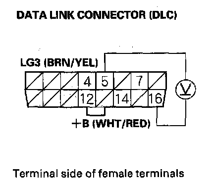 3. Measure voltage between DLC terminals No. 5 and No.16.