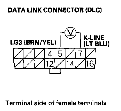 15. Measure voltage between DLC terminals No. 5 and No. 7.