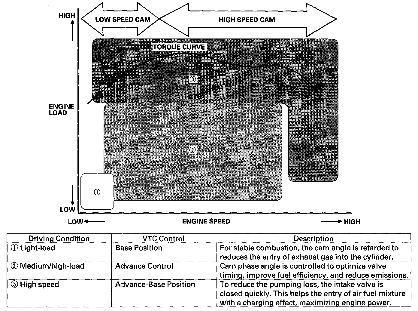 - Cam angle is advanced to obtain the EGR effect and reduce pumping loss. The intake valve is closed quickly to reduce the entry of the air/fuel mixture into the intake port and improve the charging effect.