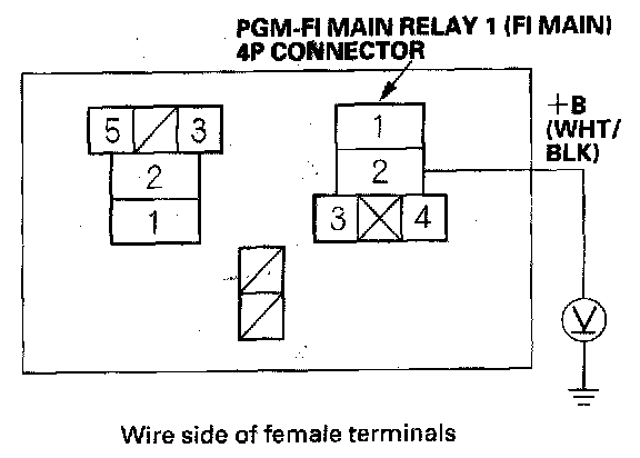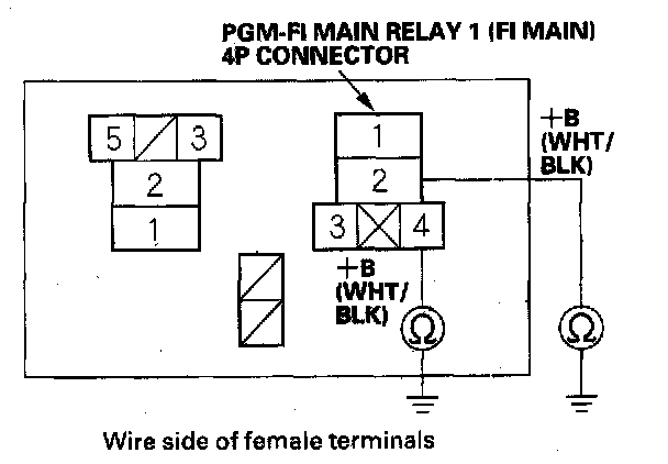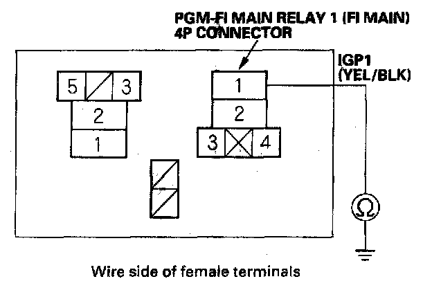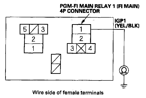 33. Check for continuity between PGM-FI main relay 1 (FI MAIN) 4P connector terminal No. 1 and body ground.